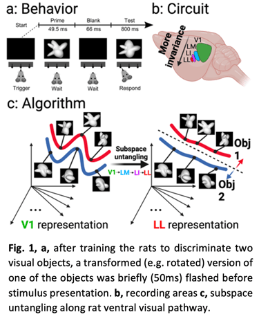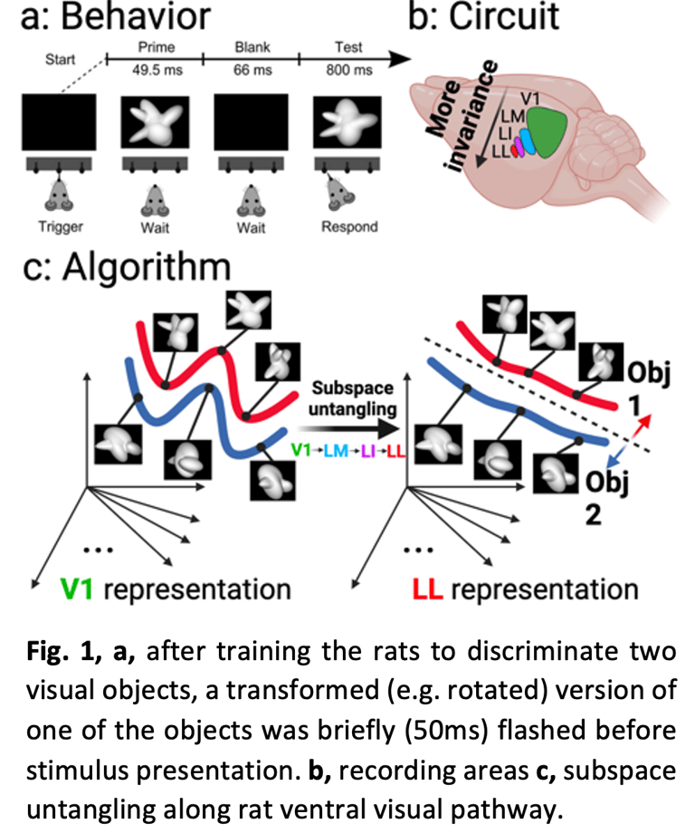 I then recorded from four visual areas in rats (Fig. 1b, V1, LM, LI, and LL) and found that neurons along these hierarchically organized regions become progressively tuned to more complex visual object attributes while becoming more view-invariant. At the population level, these representations become more linearly separable, suggesting a reformatting of representations from tangled in low-level areas such as V1 to untangled in higher-level areas such as LL (Fig. 1c, Tafazoli et al., eLife, 2017). Later, we found a similar reformatting of representations in deep neural networks (Muratore, Tafazoli, et al., NeurIPS, 2022).